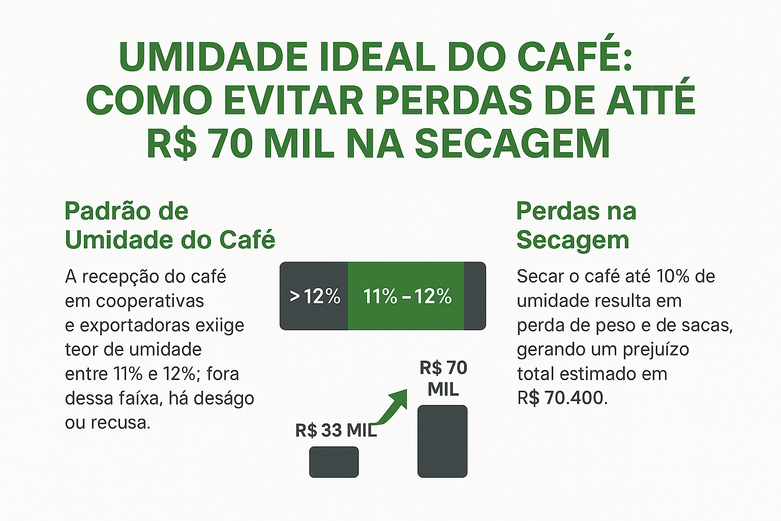 • Taxa de secagem fora do padrão pode representar até R$ 100,00 por saca em perdas.