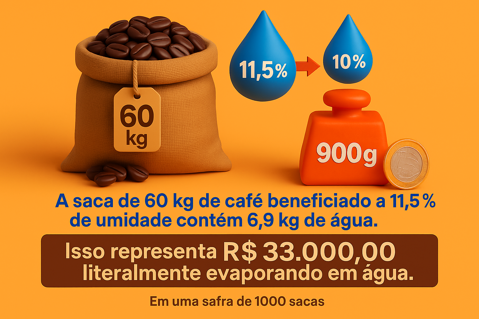 👉 Logo, os 900 g perdidos ao secar até 10% correspondem a R$ 33,00 por saca.